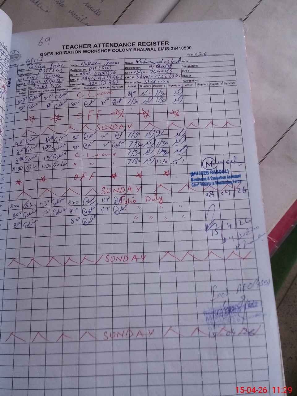 | Monitoring Date: 15-04-2026 | Start Time: 15-04-2026 11:07 AM | End Time: 15-04-2026 11:30 AM | Name of MEA: SA**** IJ**** | |