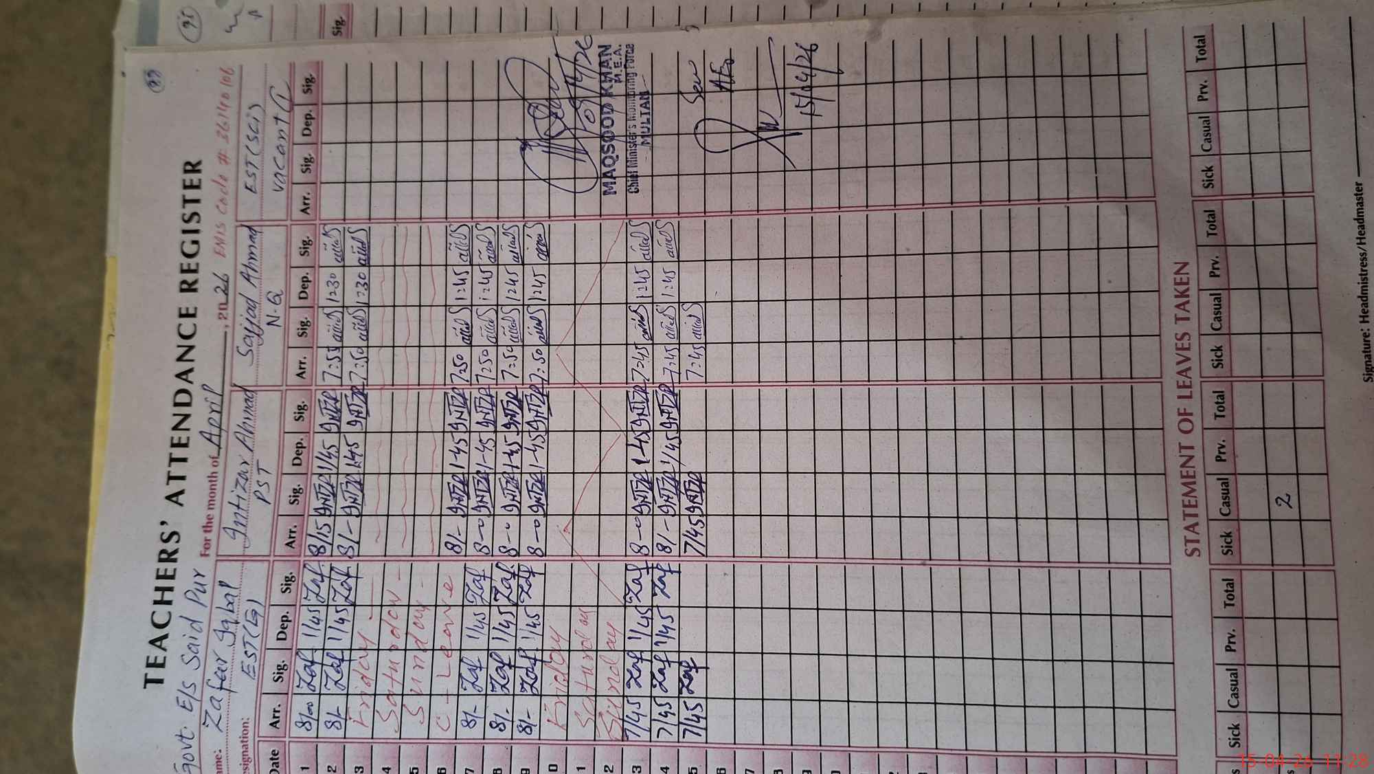 | Attendance Register | Head Teacher | MEA with School | Visit Proof |