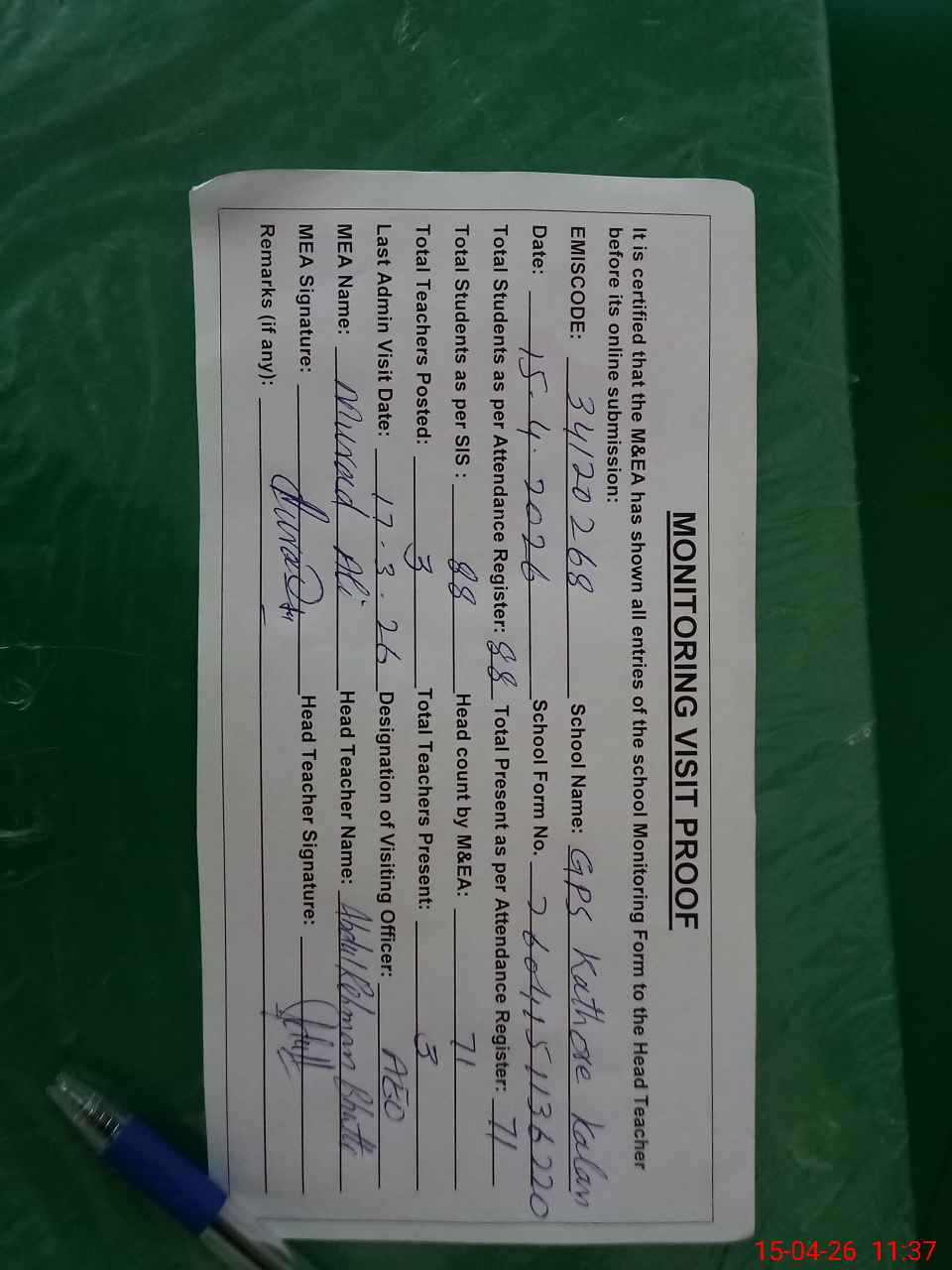 | Attendance Register | Head Teacher | MEA with School | Visit Proof |