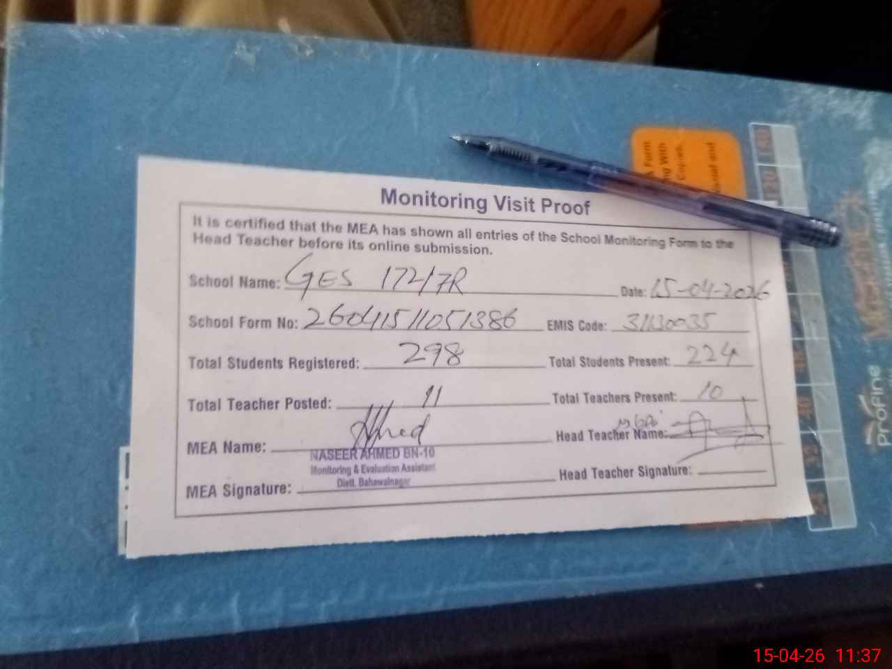 | Attendance Register | Head Teacher | MEA with School | Visit Proof |
