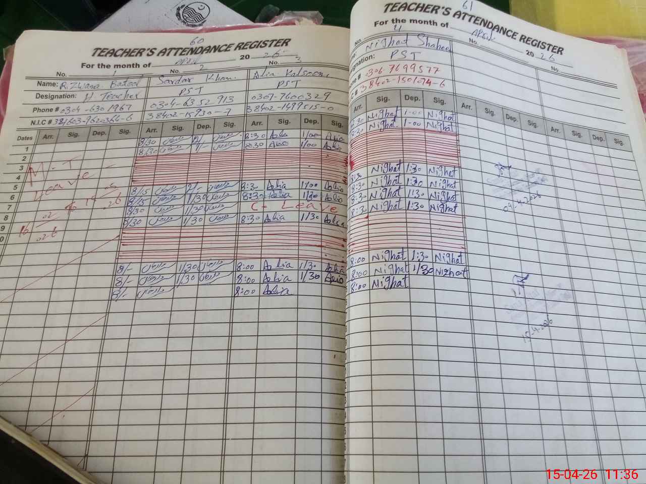 | CNIC | Full Name | Designation | R/C | Absence During Last Calender Month |