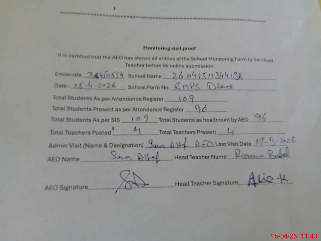 | Attendance Register | Head Teacher | MEA with School | Visit Proof |