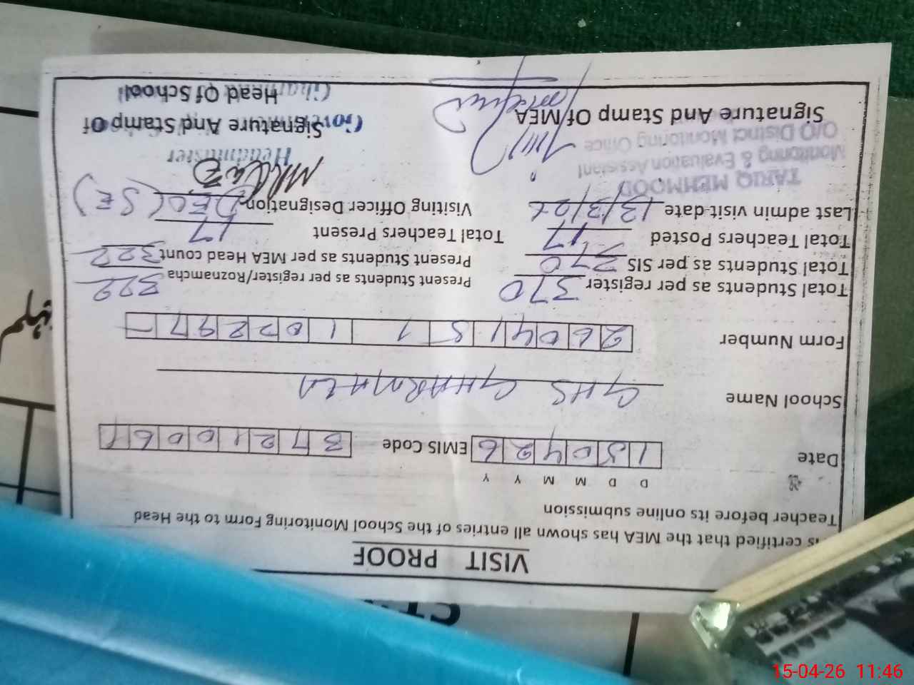 | Certified that this School was Inspected by the Undersigned MEA/DMO Today and the Information Stated Above is as Per Record. | |||||