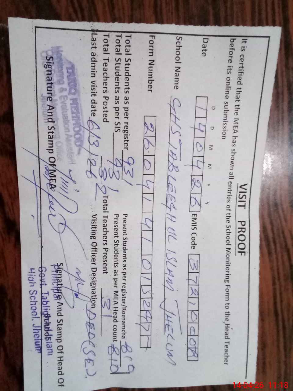 | EMIS Code: 37210008 | Name of School: GHS TABLIGH UL ISLAM JHELUM | |||