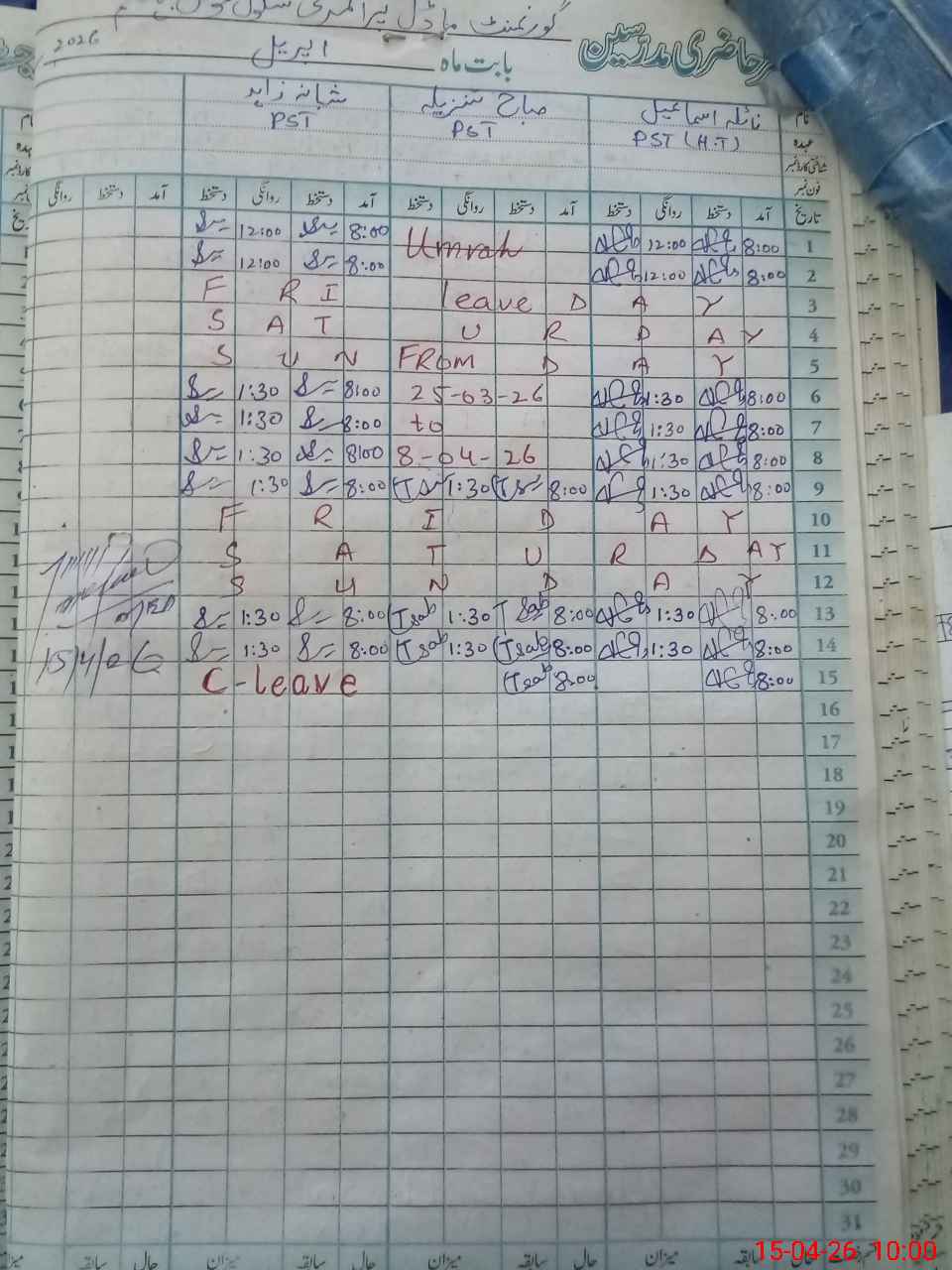 | Leave | Duty | Absent | Maternity | Medical | Ex- Pak |