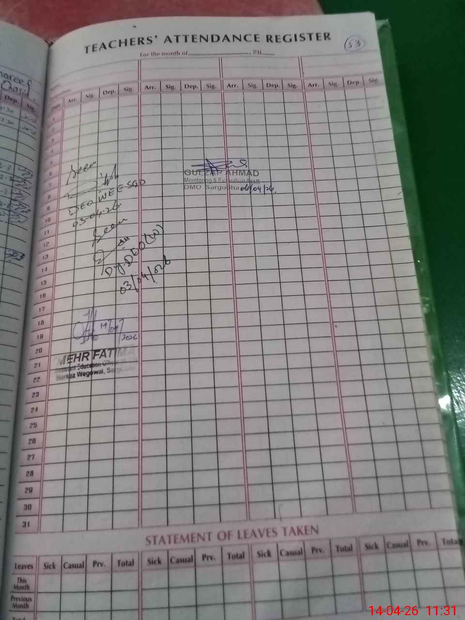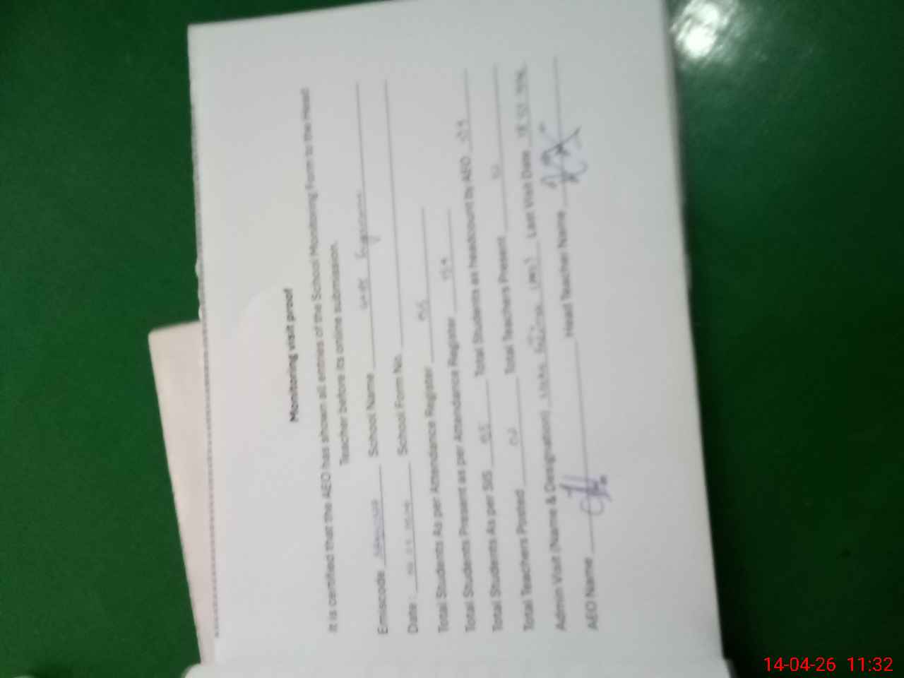 | Attendance Register | Head Teacher | MEA with School | Visit Proof |