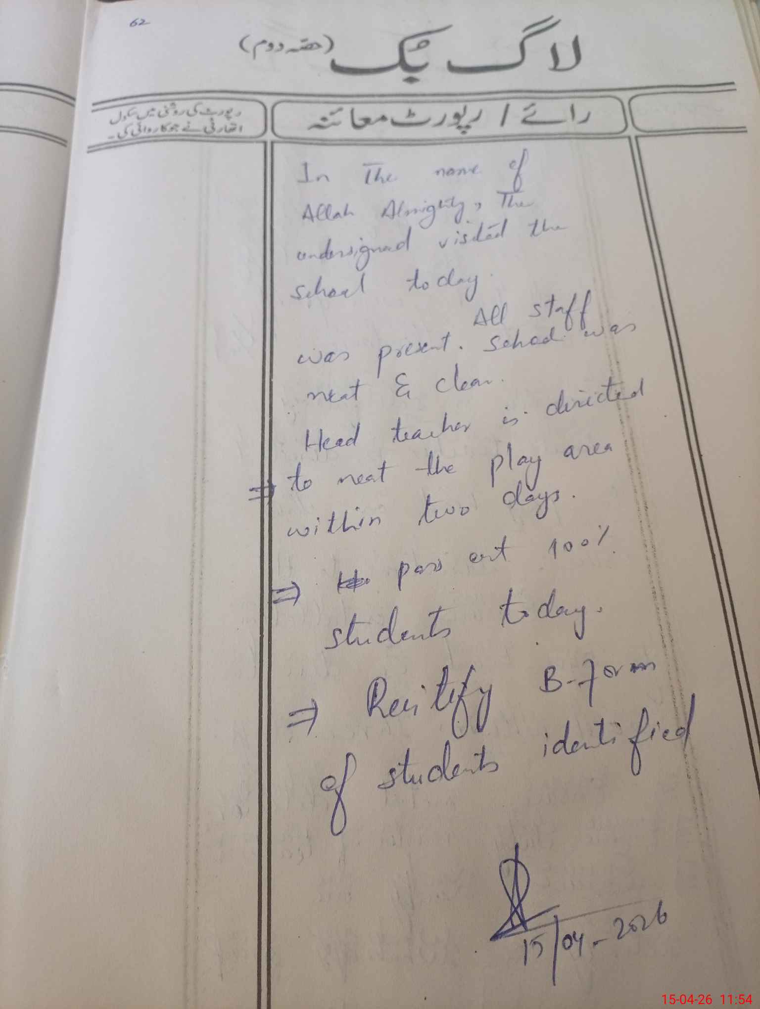 | Attendance Register | Head Teacher | MEA with School | Visit Proof |
