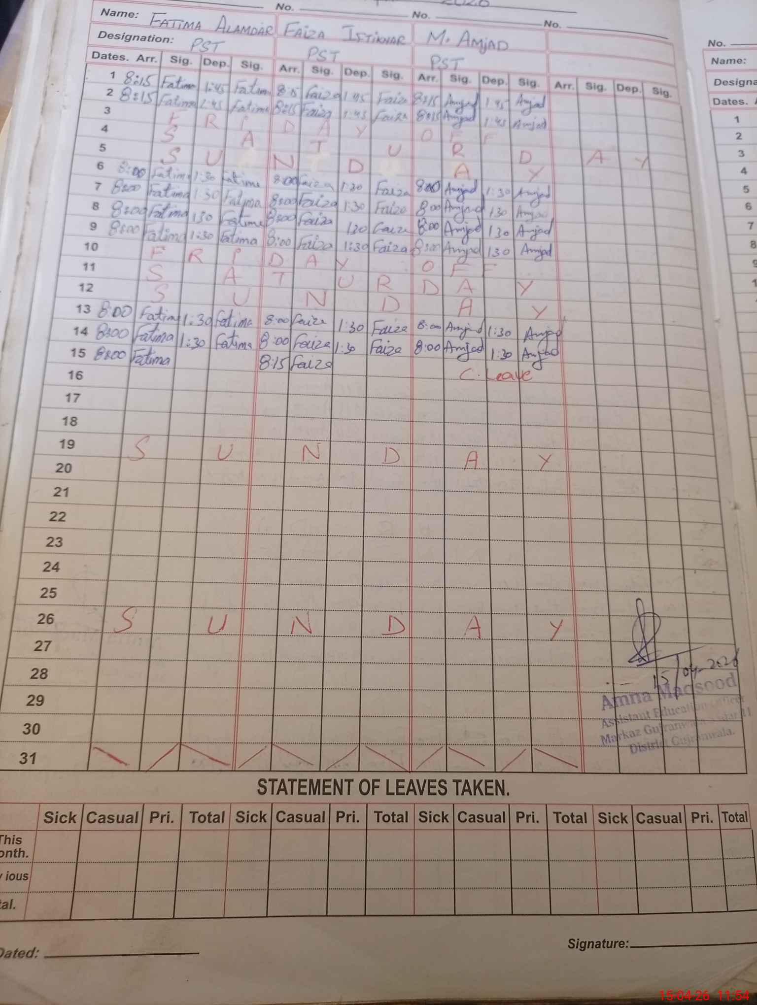 | Leave | Duty | Absent | Maternity | Medical | Ex- Pak |