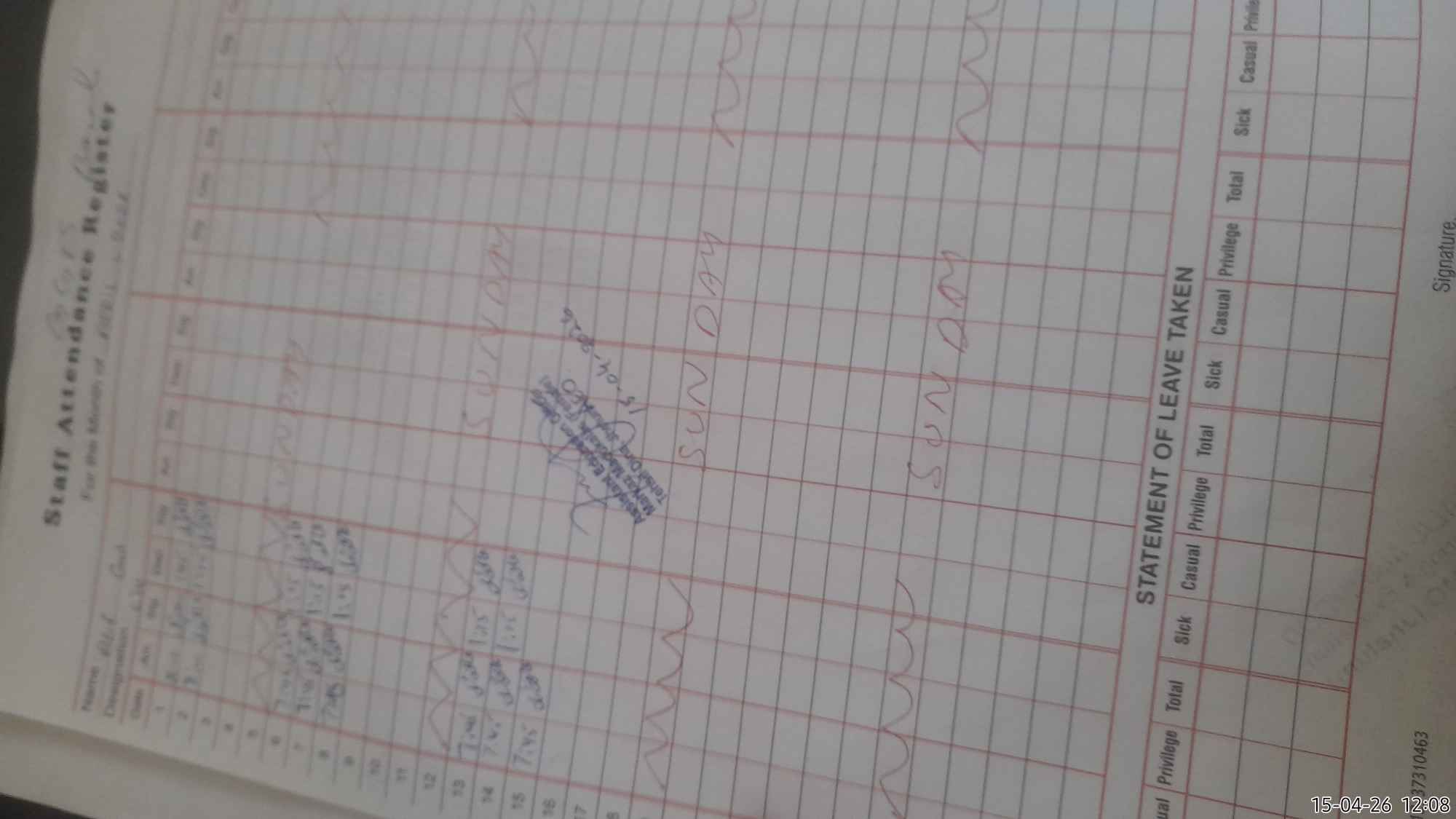 | CNIC | Full Name | Designation | R/C | Absence During Last Calender Month |