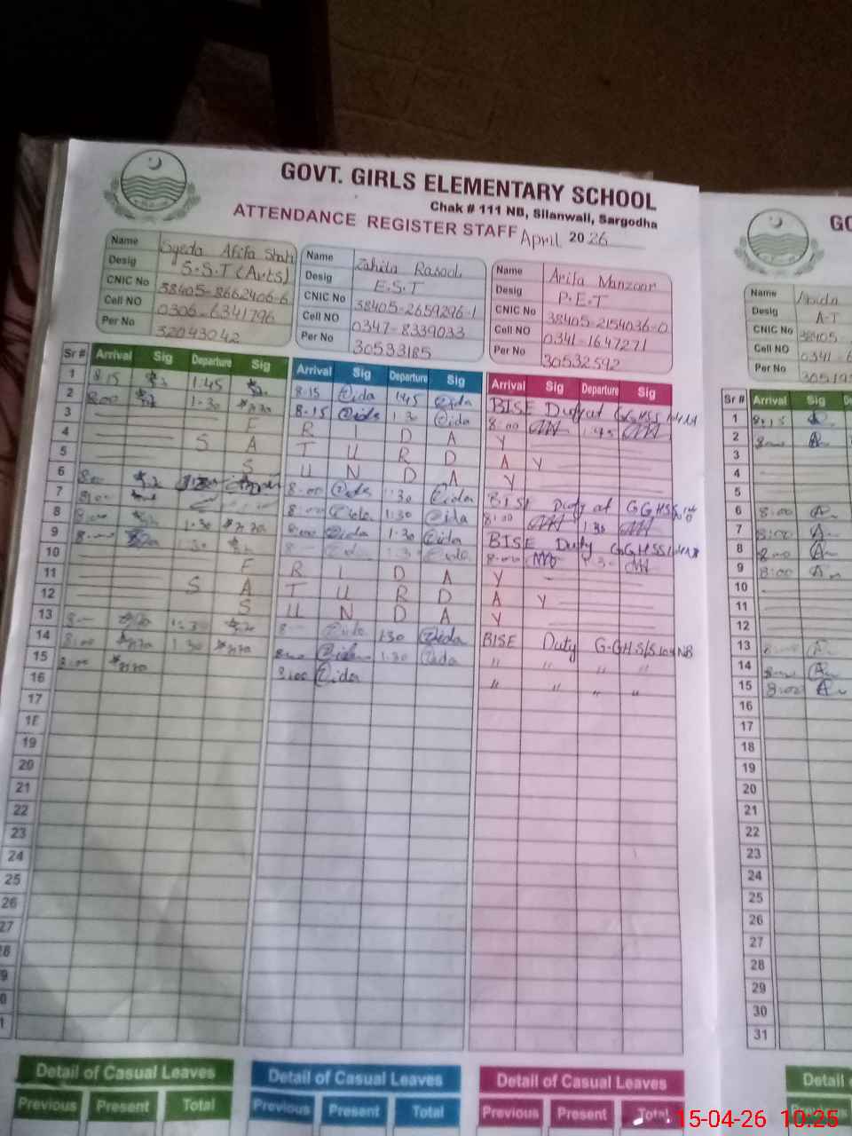 | CNIC | Full Name | Designation | R/C | Absence During Last Calender Month |
