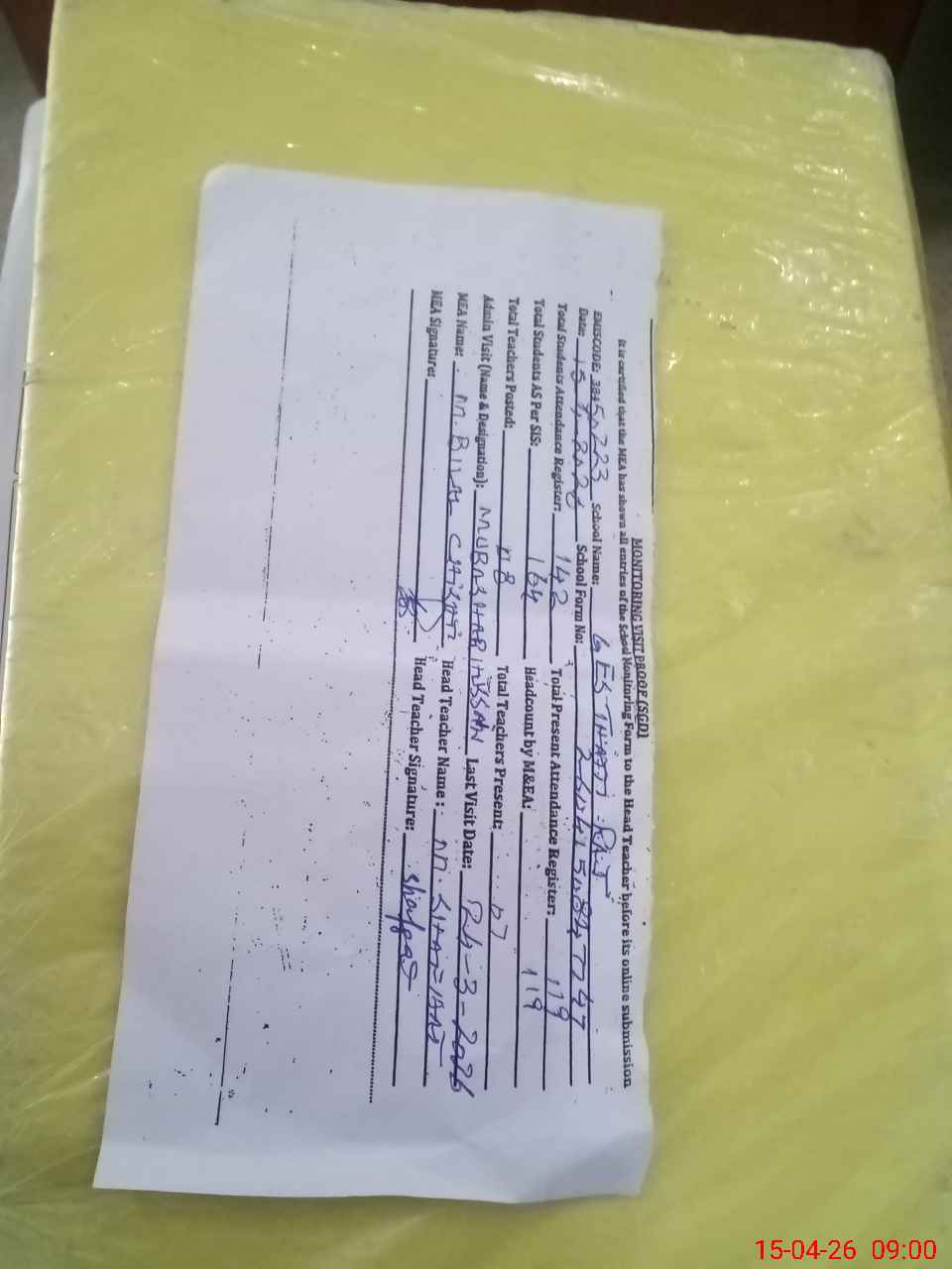 | Attendance Register | Head Teacher | MEA with School | Visit Proof |
