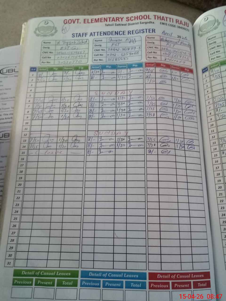 | CNIC | Full Name | Designation | R/C | Absence During Last Calender Month |