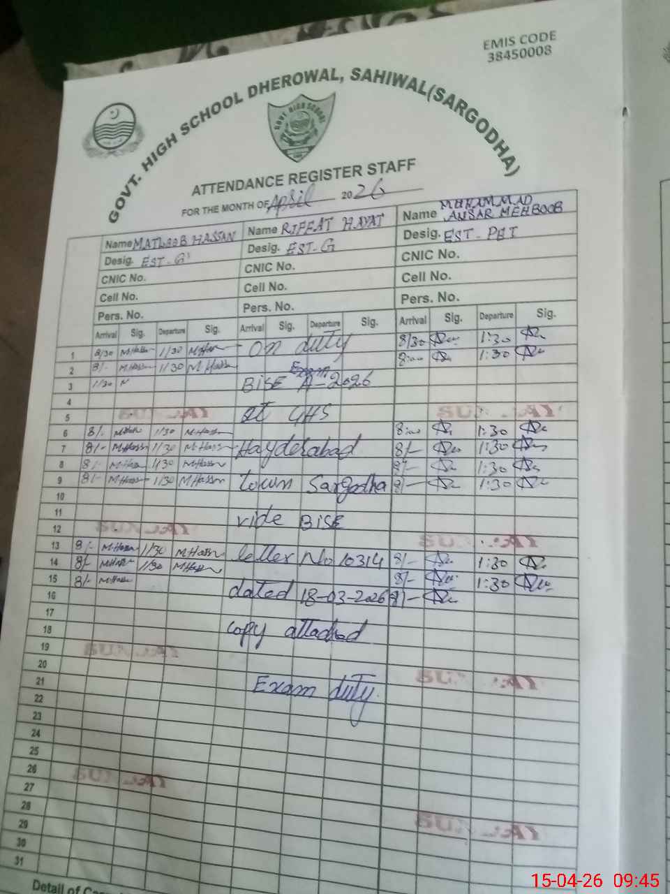 | District: SARGODHA | Tehsil: SAHIWAL | Markaz: SECONDARY-WING | Level: High | |