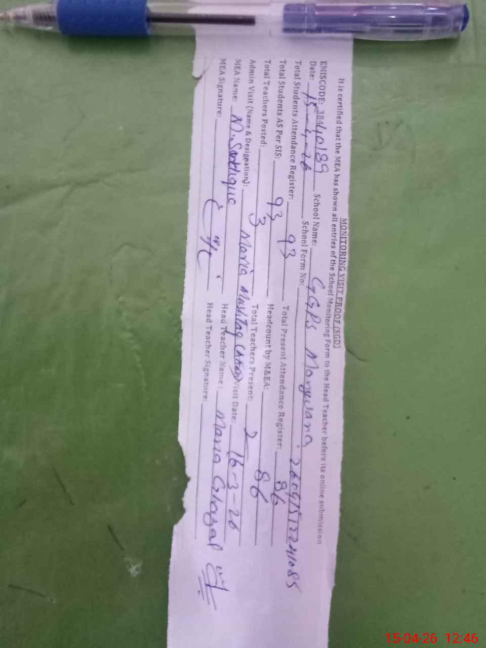 | Attendance Register | Head Teacher | MEA with School | Visit Proof |