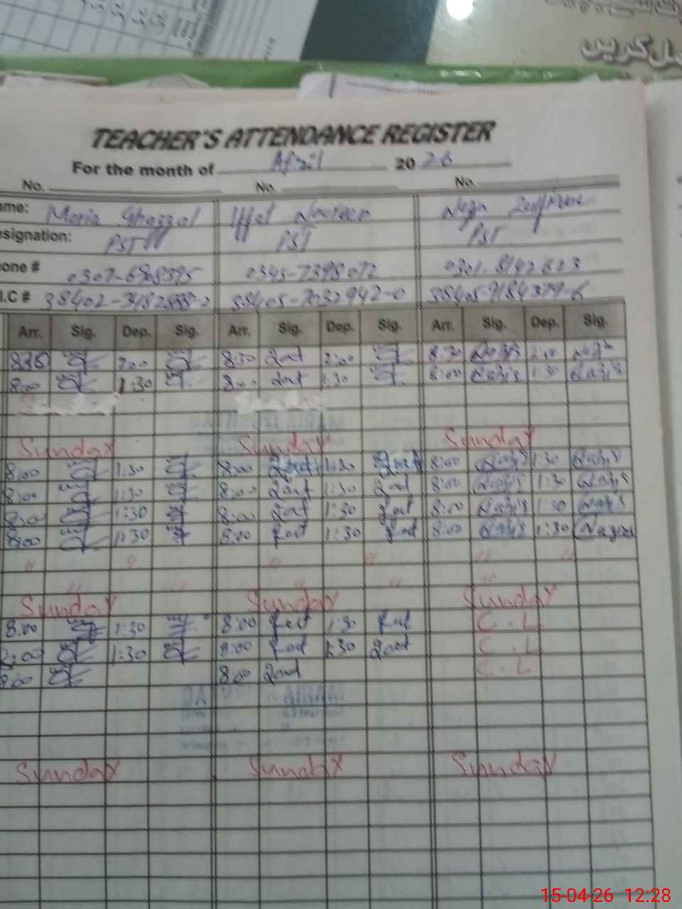 | CNIC | Full Name | Designation | R/C | Absence During Last Calender Month |