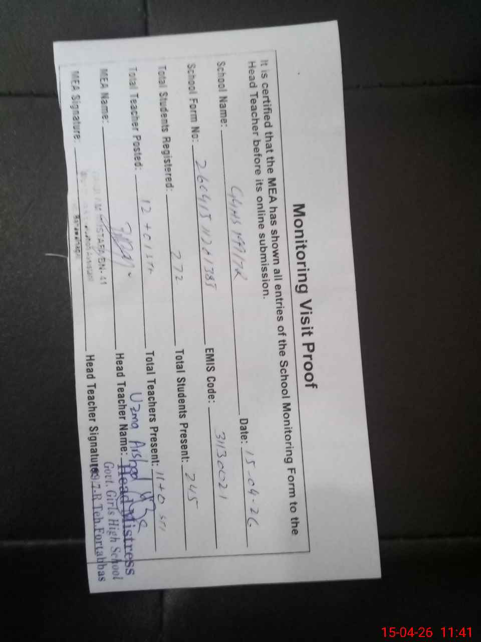 | Attendance Register | Head Teacher | MEA with School | Visit Proof |