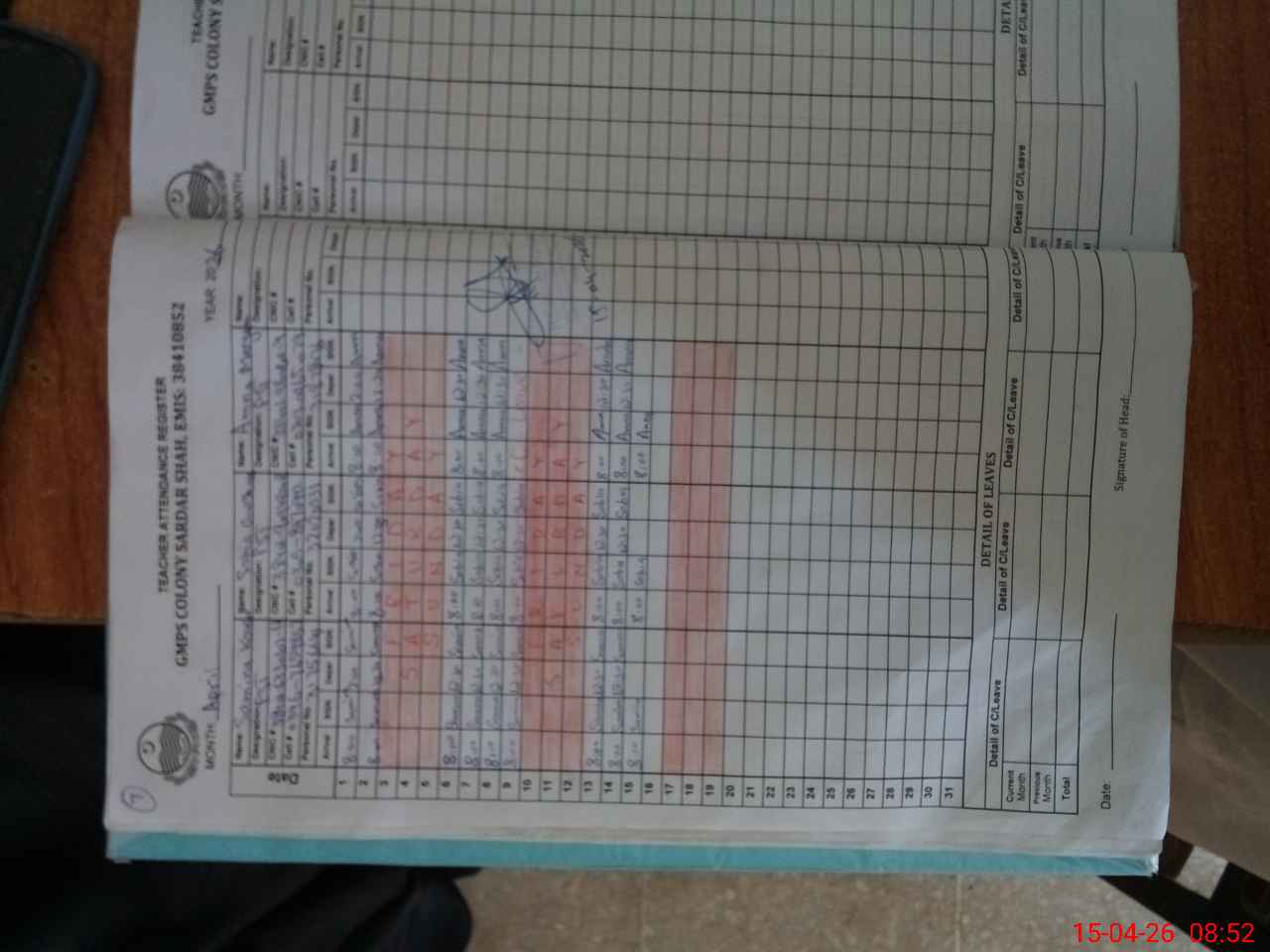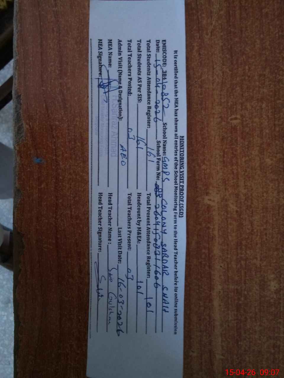 | EMIS Code: 38410852 | Name of School: GMPS COLONY SARDAR SHAH | |||
