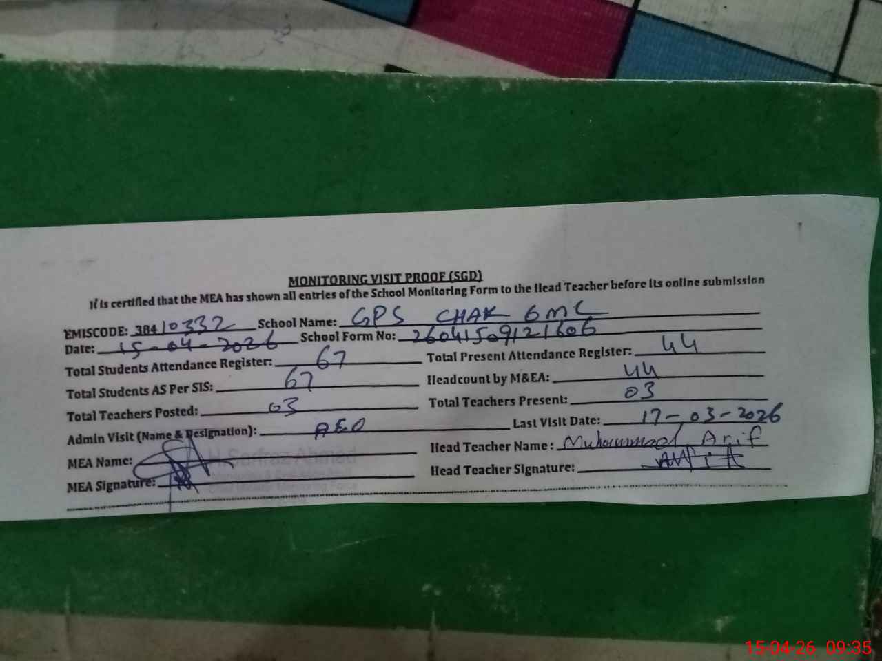 | Attendance Register | Head Teacher | MEA with School | Visit Proof |
