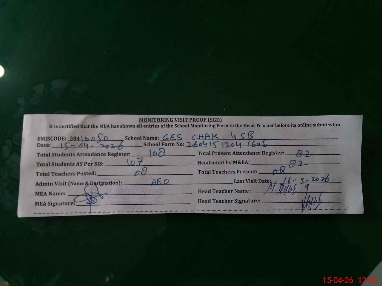 | EMIS Code: 38410050 | Name of School: GES CHAK NO.4 SB | |||