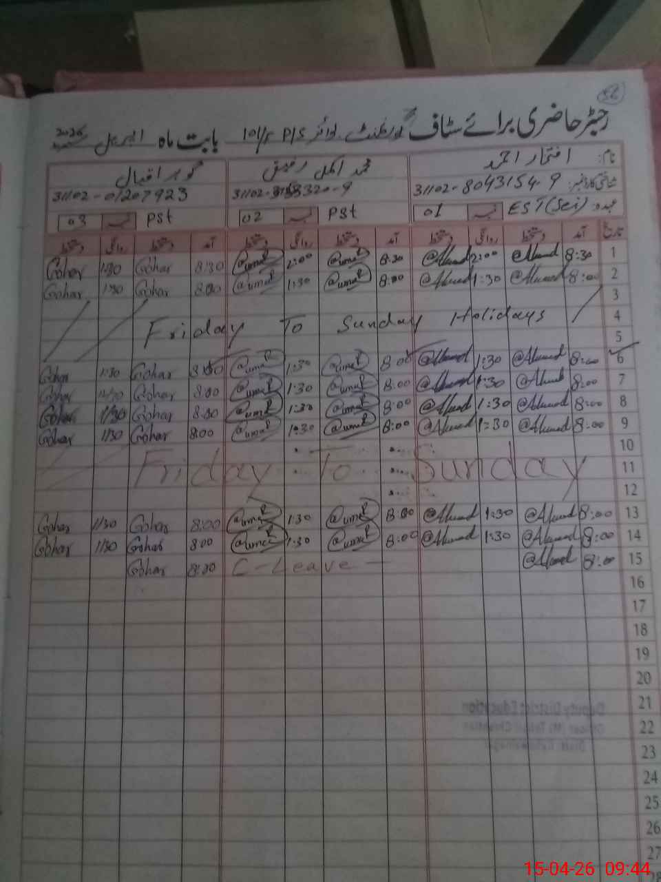 | CNIC | Full Name | Designation | R/C | Absence During Last Calender Month |