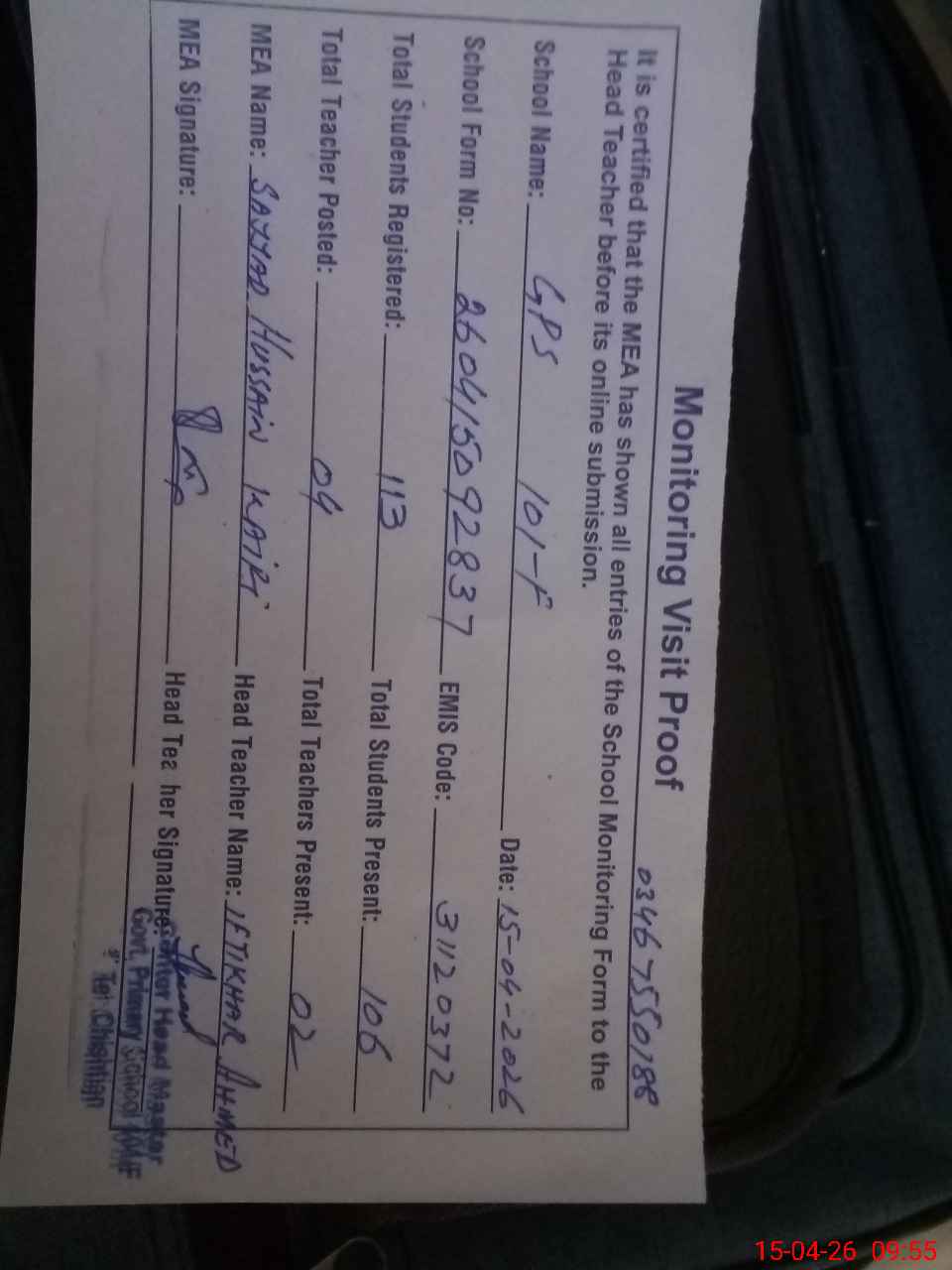 | Attendance Register | Head Teacher | MEA with School | Visit Proof |