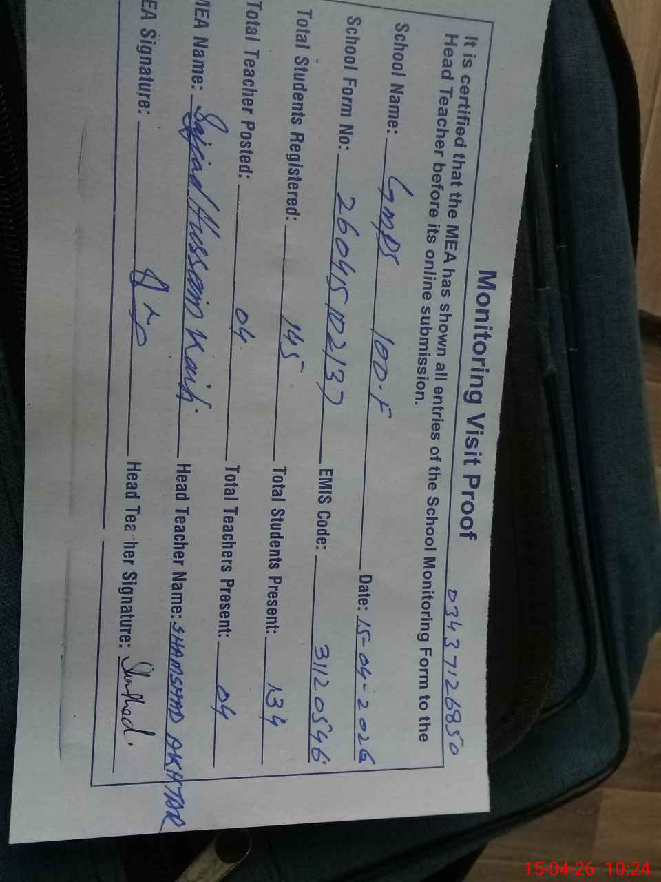 | EMIS Code: 31120546 | Name of School: GMPS CHAK NO 100/F | |||