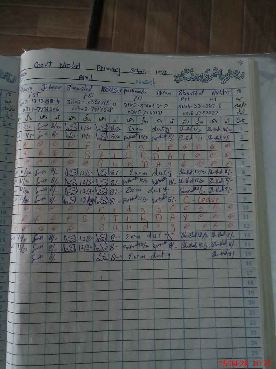 | 31**** | Fa**** Ak**** | PST Science/Maths | Regular | 2 | 2 | 0 | 0 | 0 | 0 | 0 | 0 | 2 | Exam Duty |