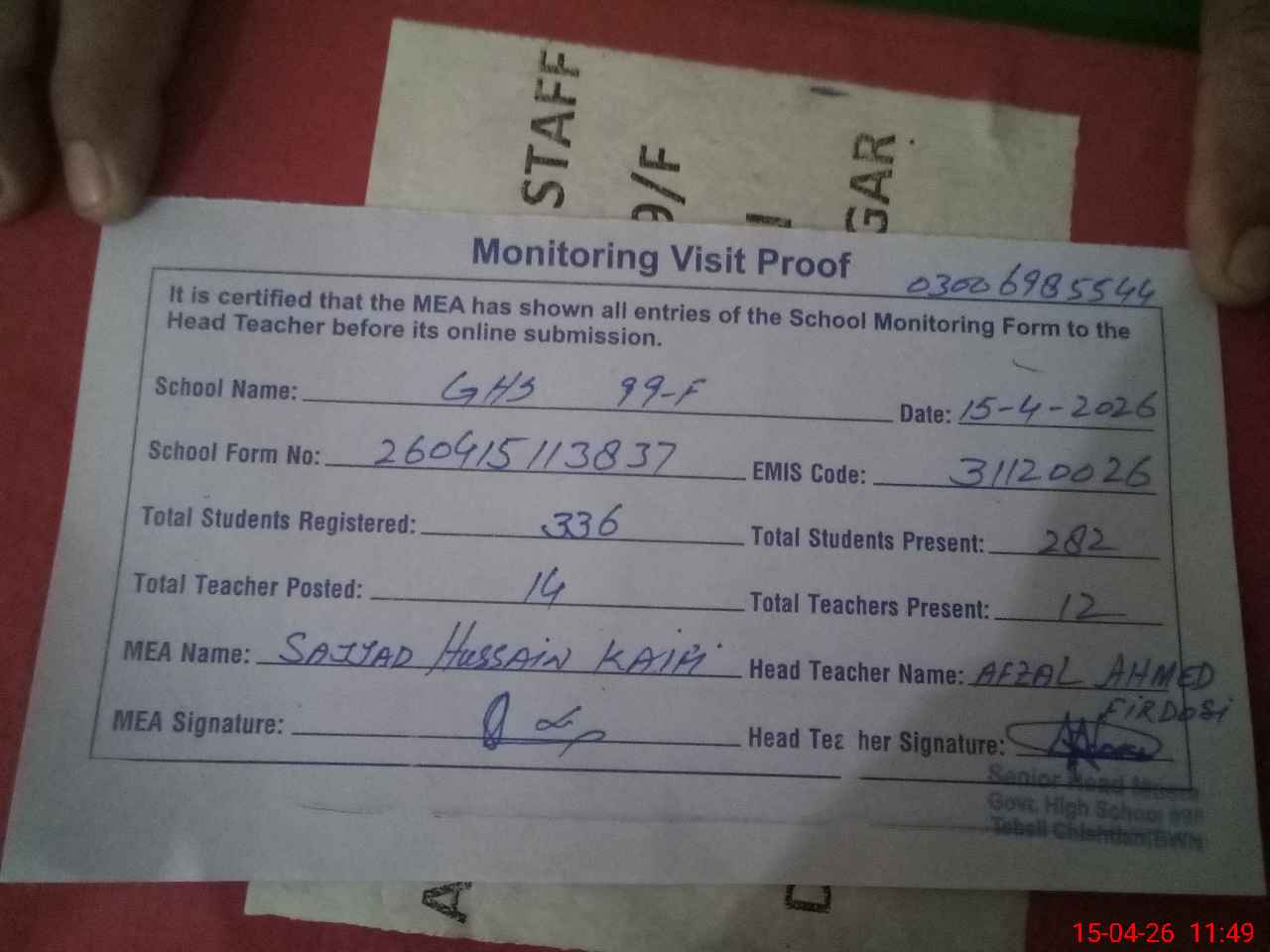 | Name: Af**** Ah**** Fi**** Designation: (School Headmaster's/Headmistress's) SHM Phone/Cell Number: 03**** |