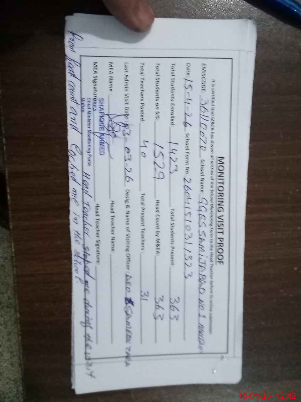 | Attendance Register | Head Teacher | MEA with School | Visit Proof |