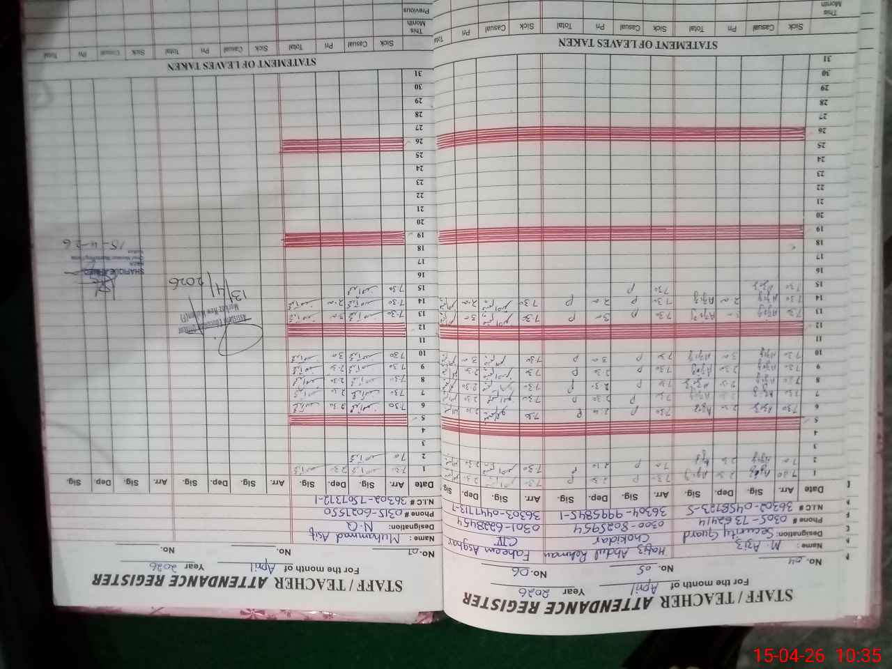 | CNIC | Full Name | Designation | R/C | Absence During Last Calender Month |