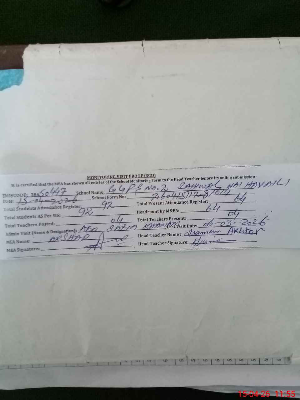 | Attendance Register | Head Teacher | MEA with School | Visit Proof |