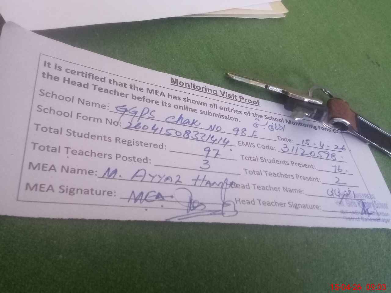 | EMIS Code: 31120598 | Name of School: GGPS 98/F AZAFI BASTI | |||