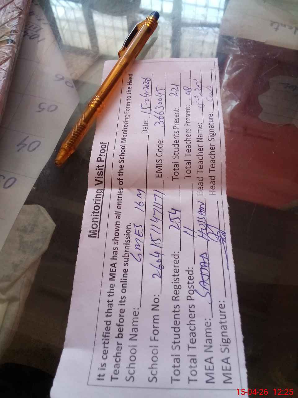 | Attendance Register | Head Teacher | MEA with School | Visit Proof |