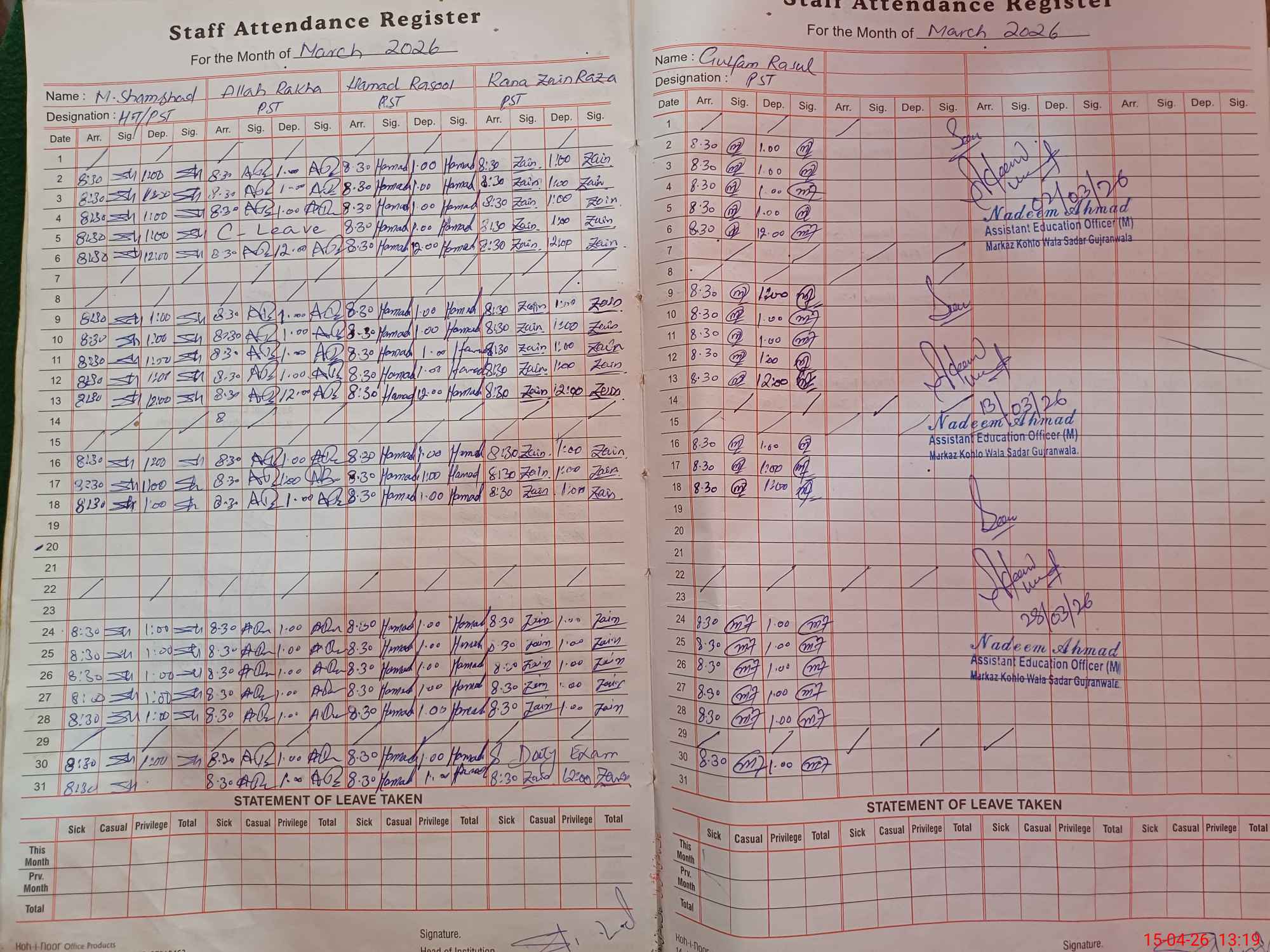| CNIC | Full Name | Designation | R/C | Absence During Last Calender Month |
