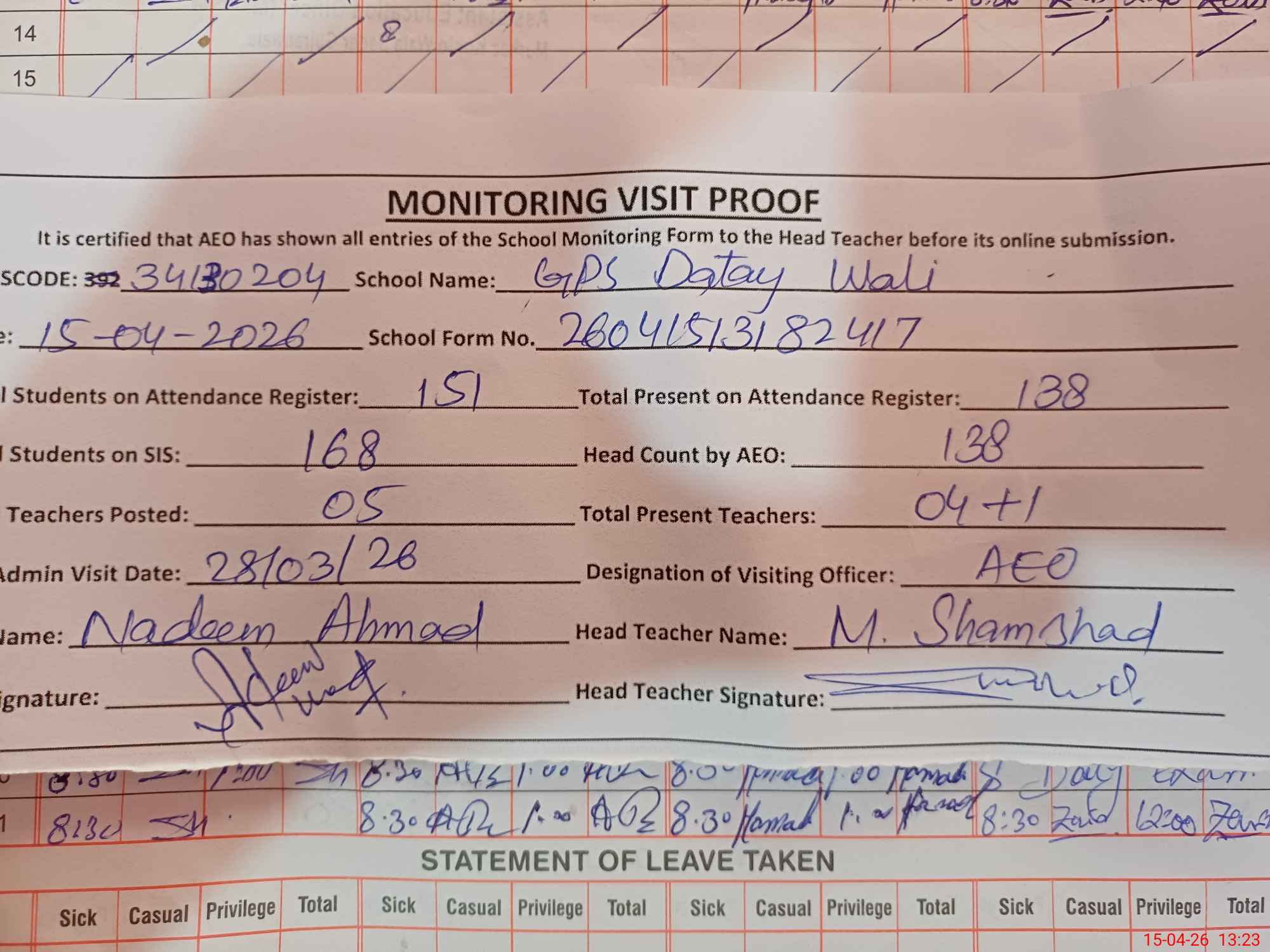 | Attendance Register | Head Teacher | MEA with School | Visit Proof |