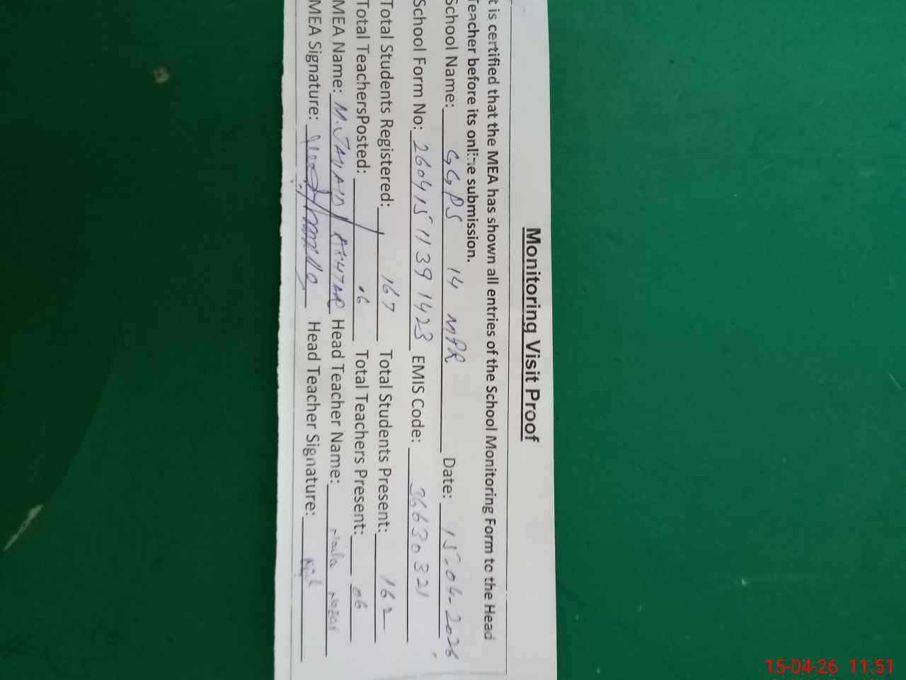 | Attendance Register | Head Teacher | MEA with School | Visit Proof |