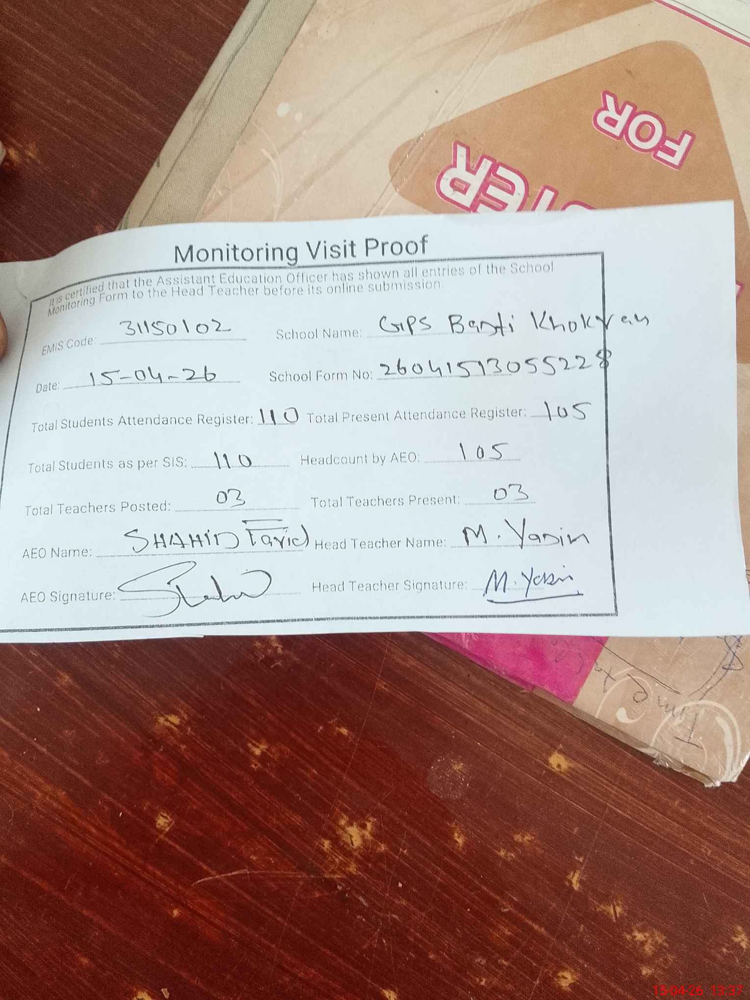 | Attendance Register | Head Teacher | MEA with School | Visit Proof |