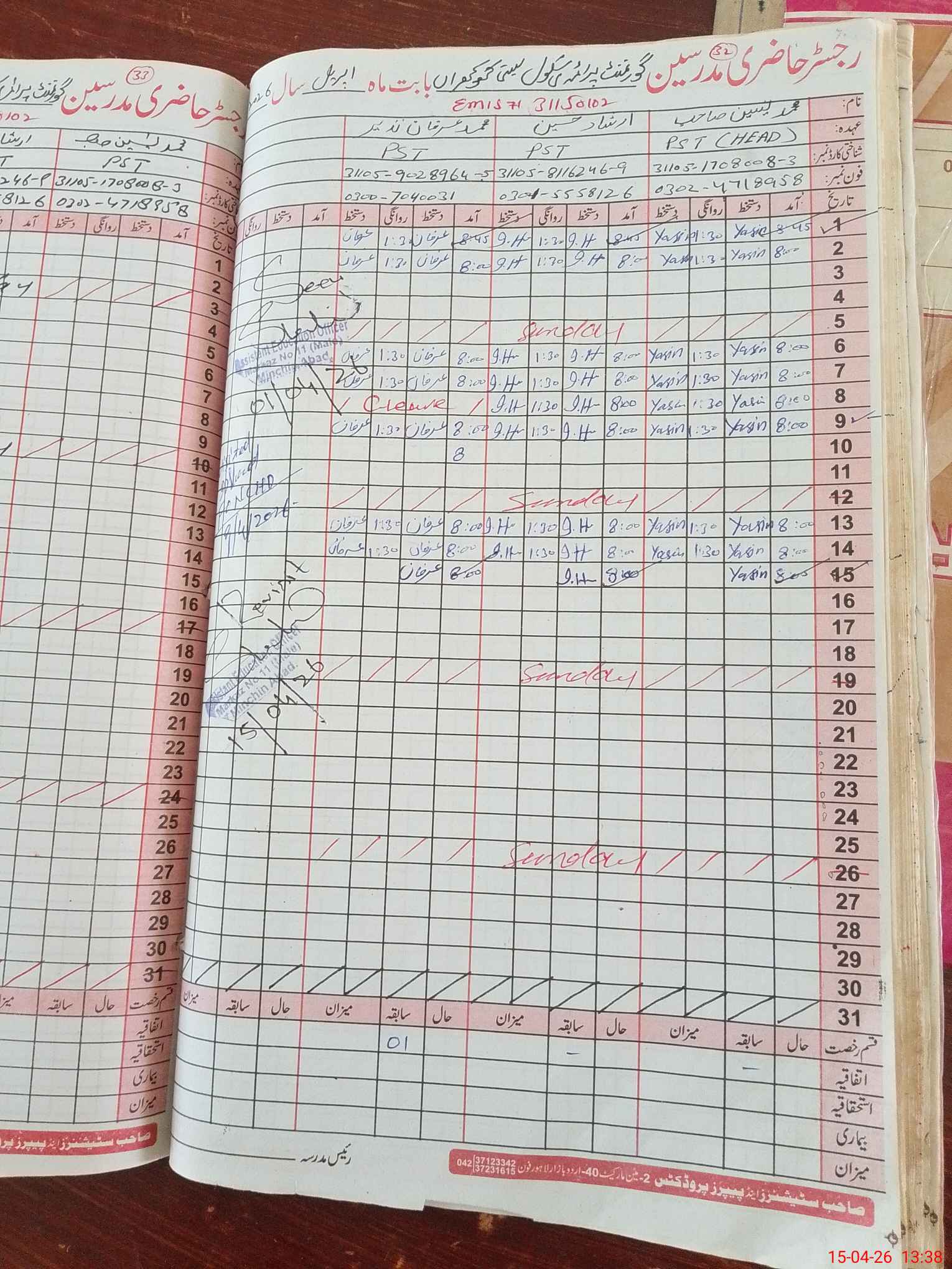 | CNIC | Full Name | Designation | R/C | Absence During Last Calender Month |