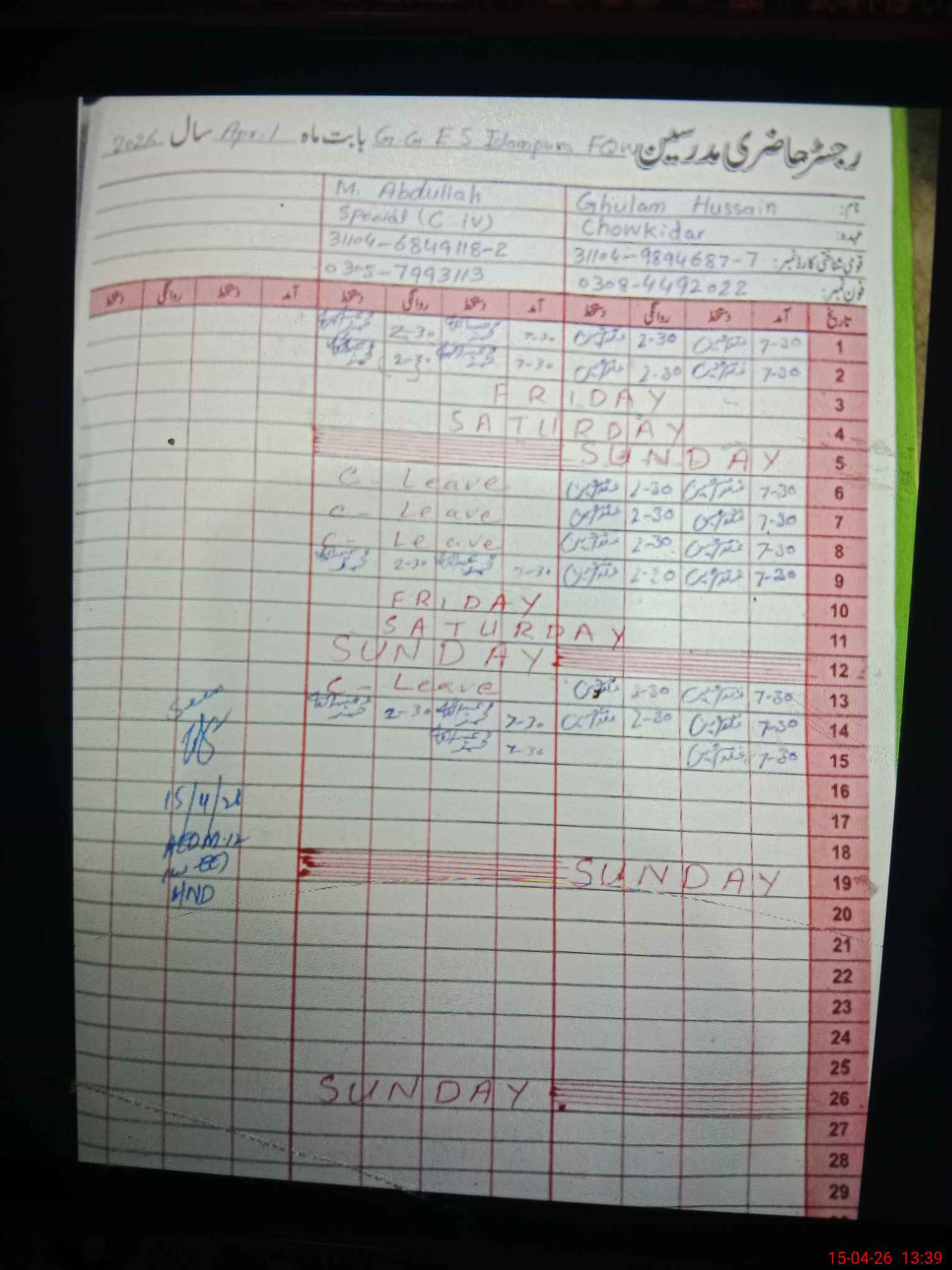 | CNIC | Full Name | Designation | R/C | Absence During Last Calender Month |