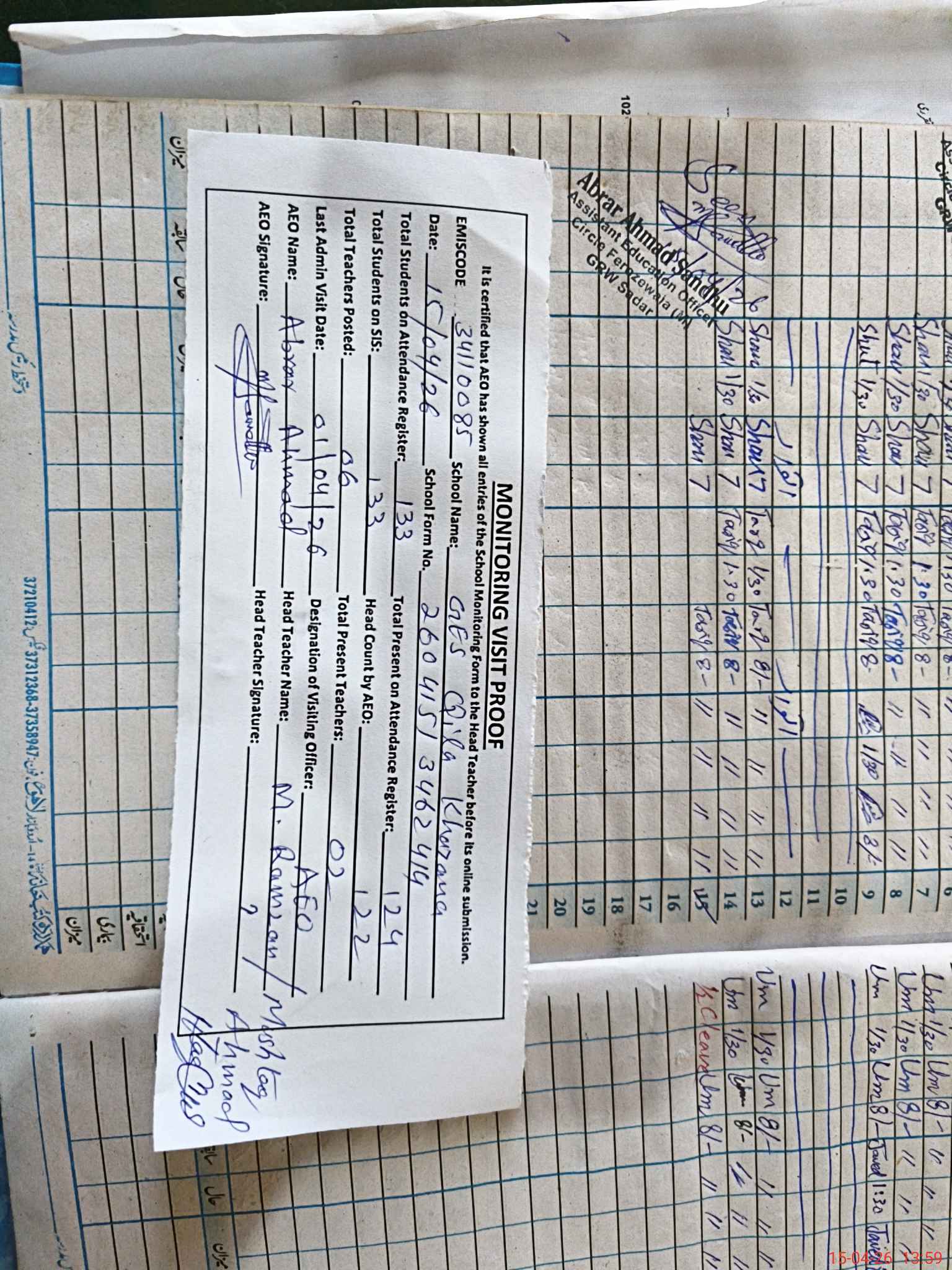 | Attendance Register | Head Teacher | MEA with School | Visit Proof |