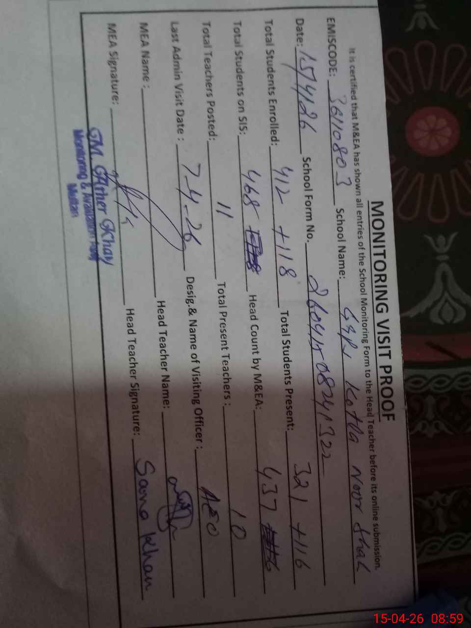 | Attendance Register | Head Teacher | MEA with School | Visit Proof |