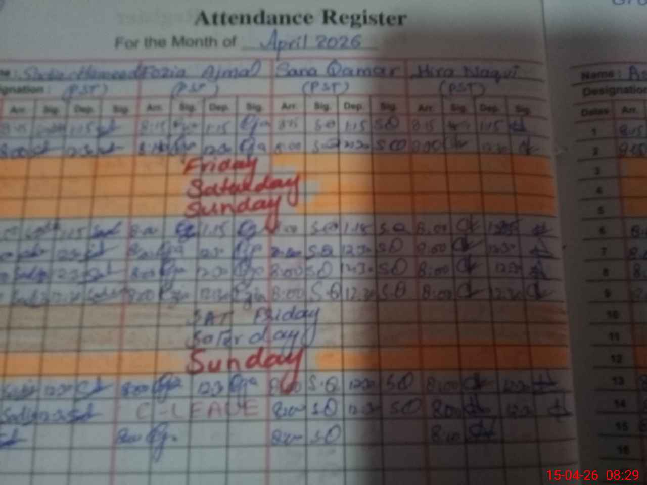 | CNIC | Full Name | Designation | R/C | Absence During Last Calender Month |