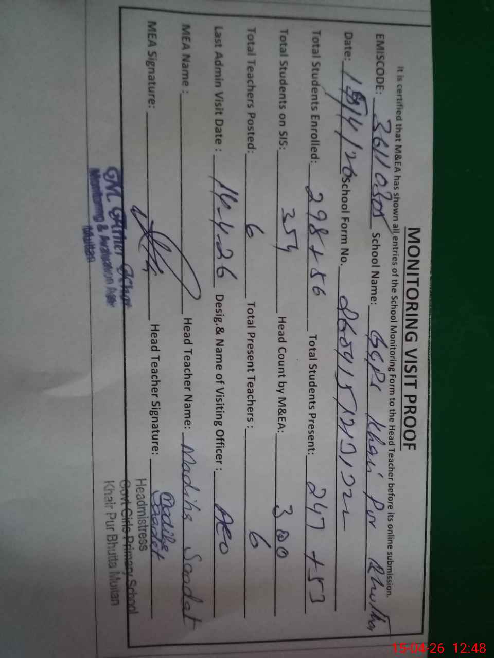| Certified that this School was Inspected by the Undersigned MEA/DMO Today and the Information Stated Above is as Per Record. | |||||