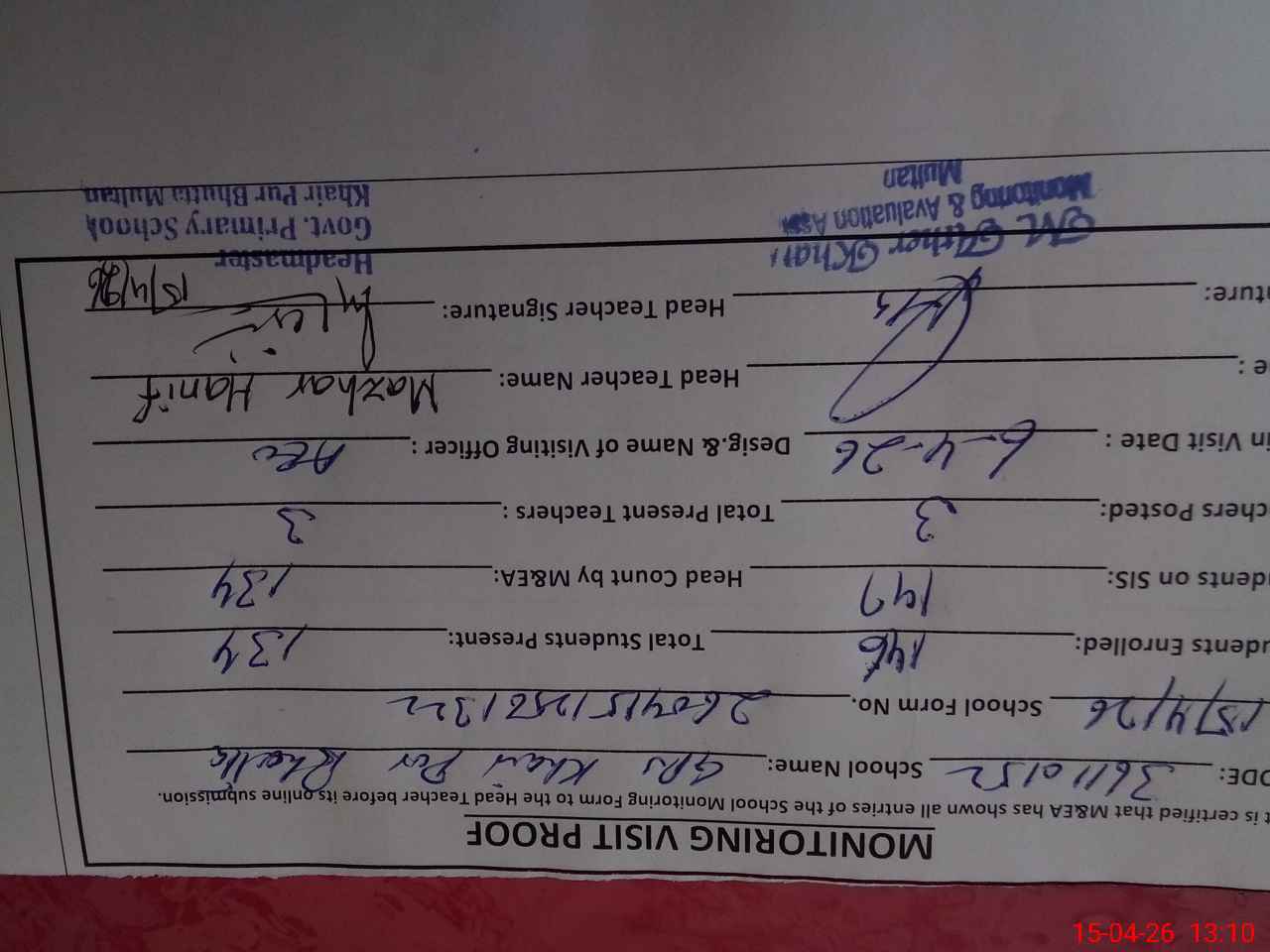 | EMIS Code: 36110152 | Name of School: GPS KHAIR PUR BHUTTA CANTT P/O QASIM BELLA | |||