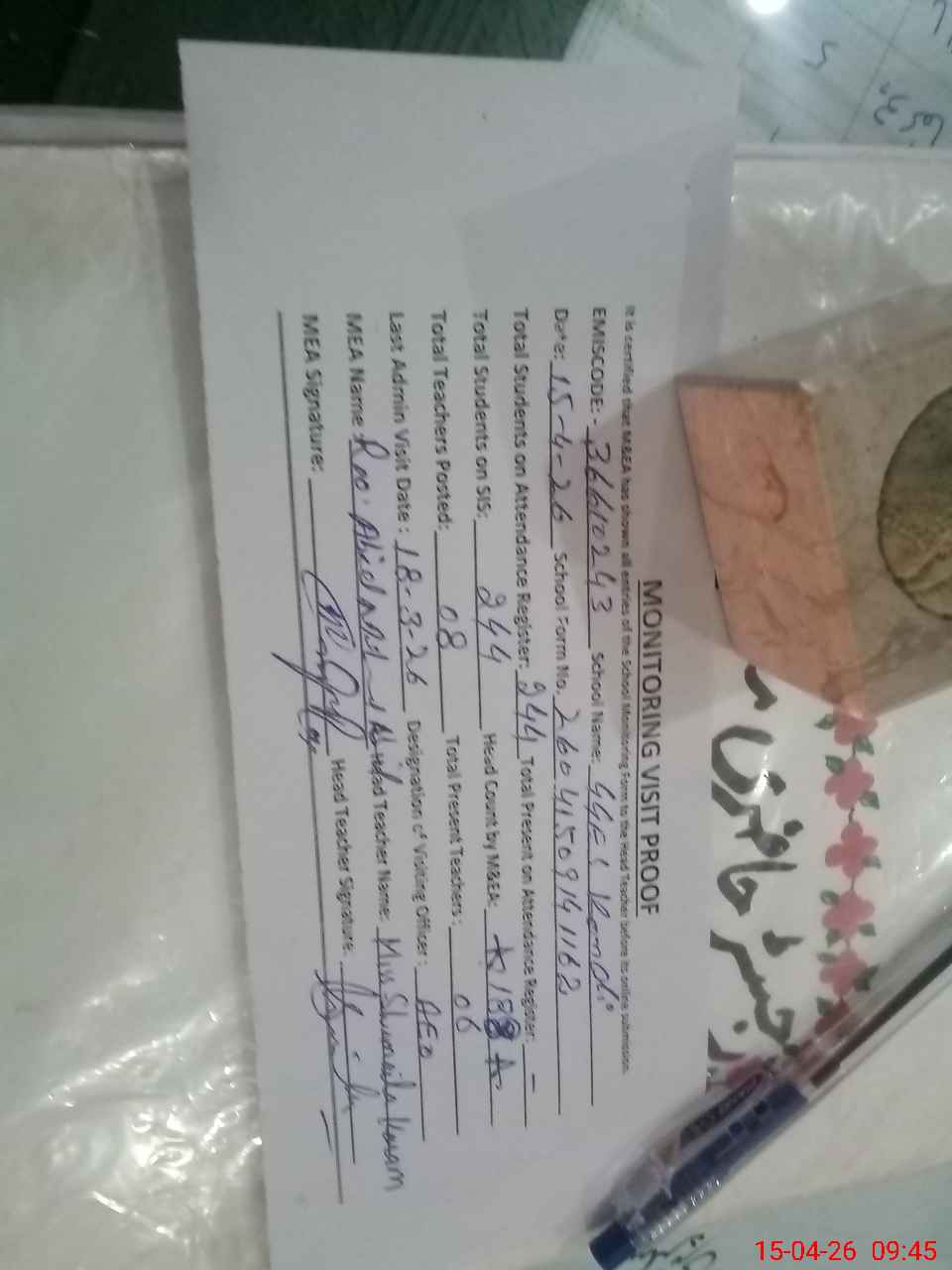 | Attendance Register | Head Teacher | MEA with School | Visit Proof |