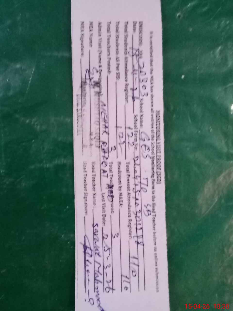 | Attendance Register | Head Teacher | MEA with School | Visit Proof |