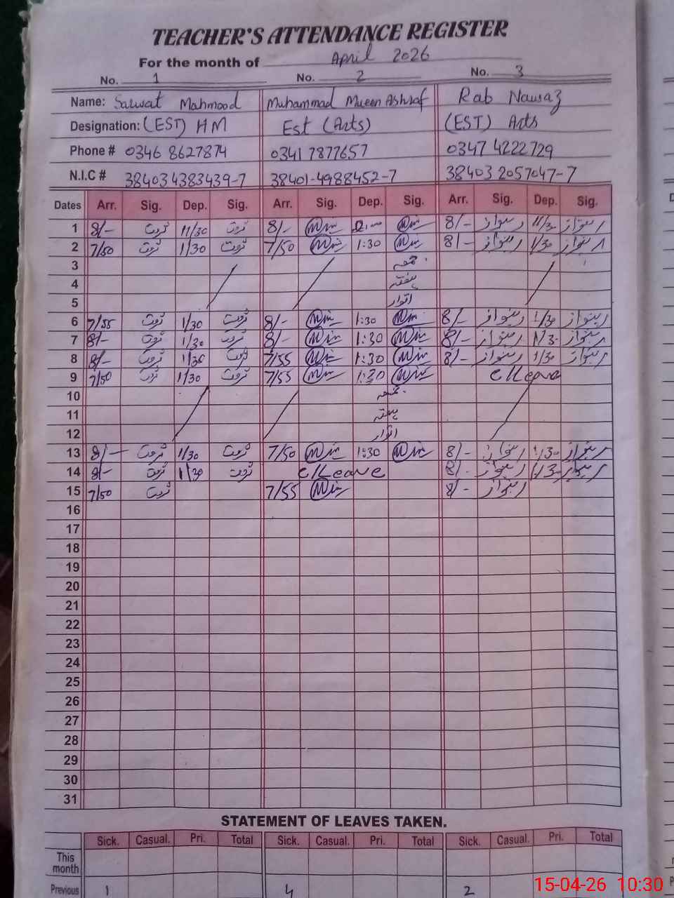 | CNIC | Full Name | Designation | R/C | Absence During Last Calender Month |