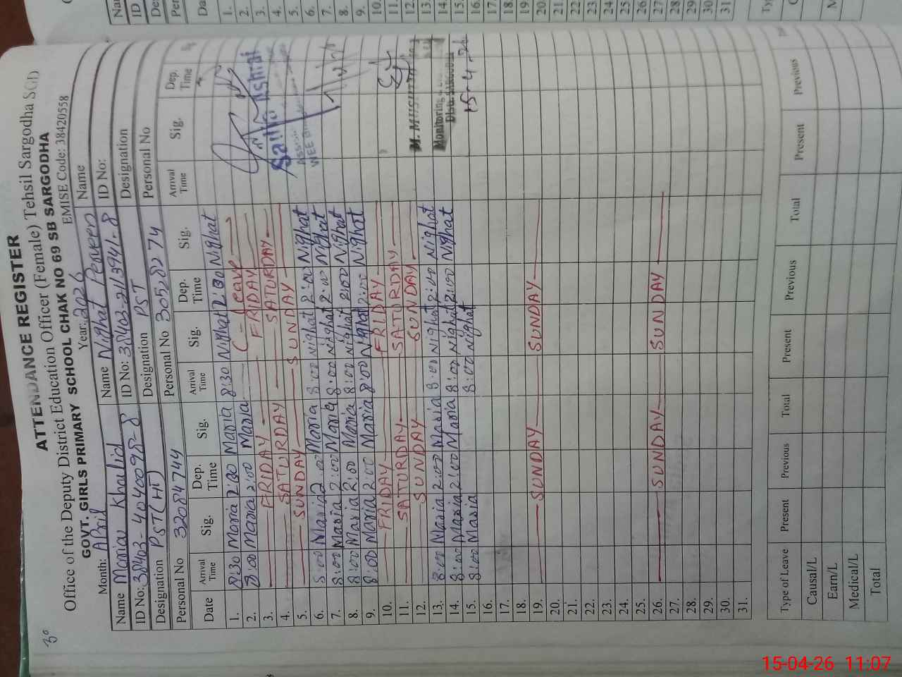 | Name: MA**** KH**** Designation: (School Headmaster's/Headmistress's) PST Phone/Cell Number: 03**** |