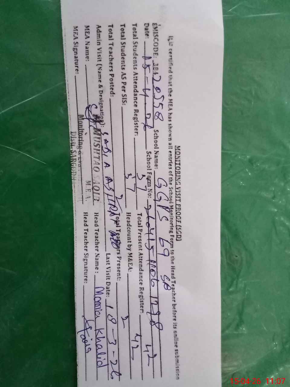| Attendance Register | Head Teacher | MEA with School | Visit Proof |