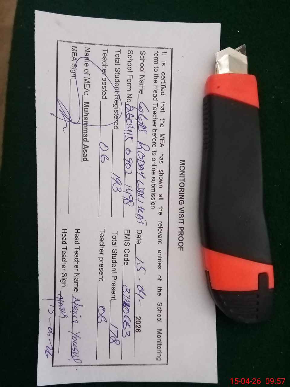| Attendance Register | Head Teacher | MEA with School | Visit Proof |